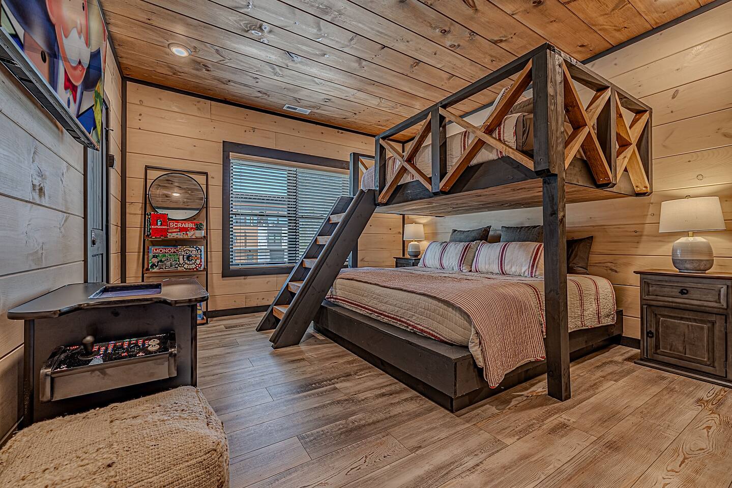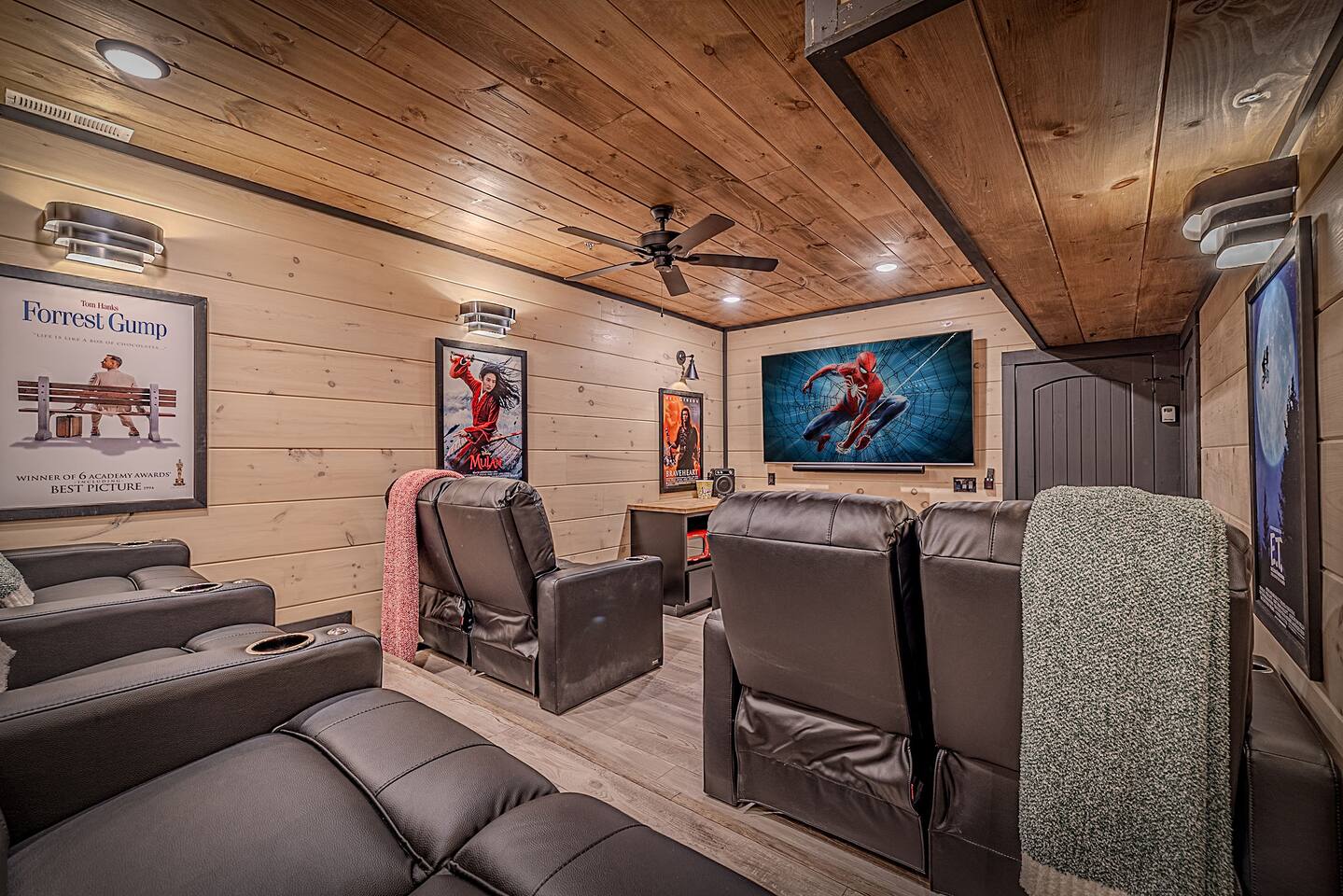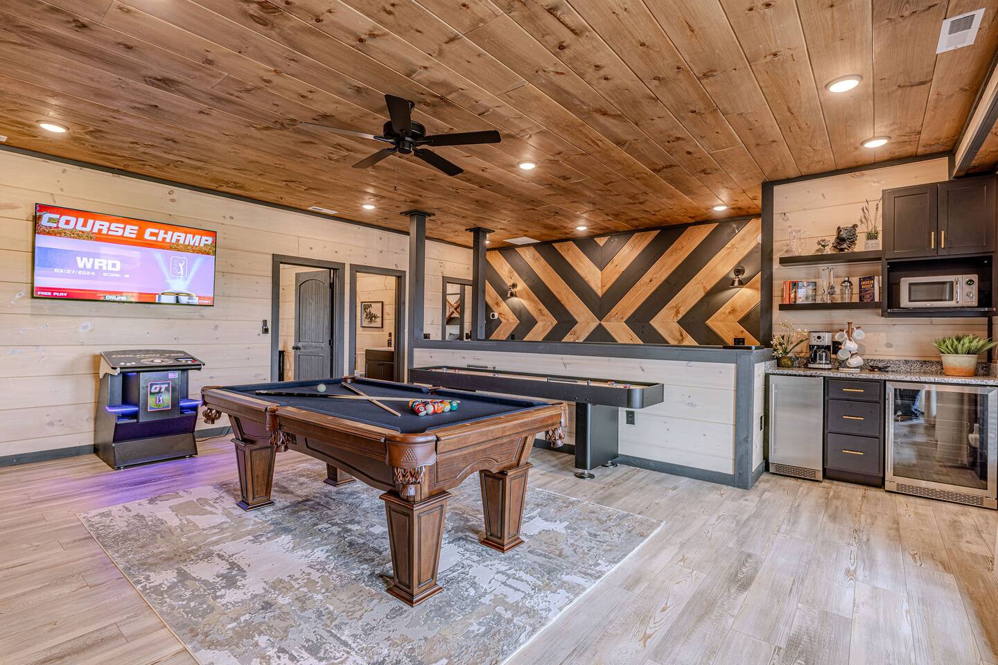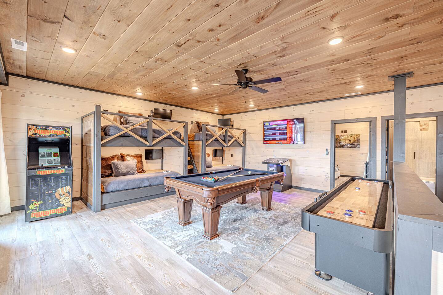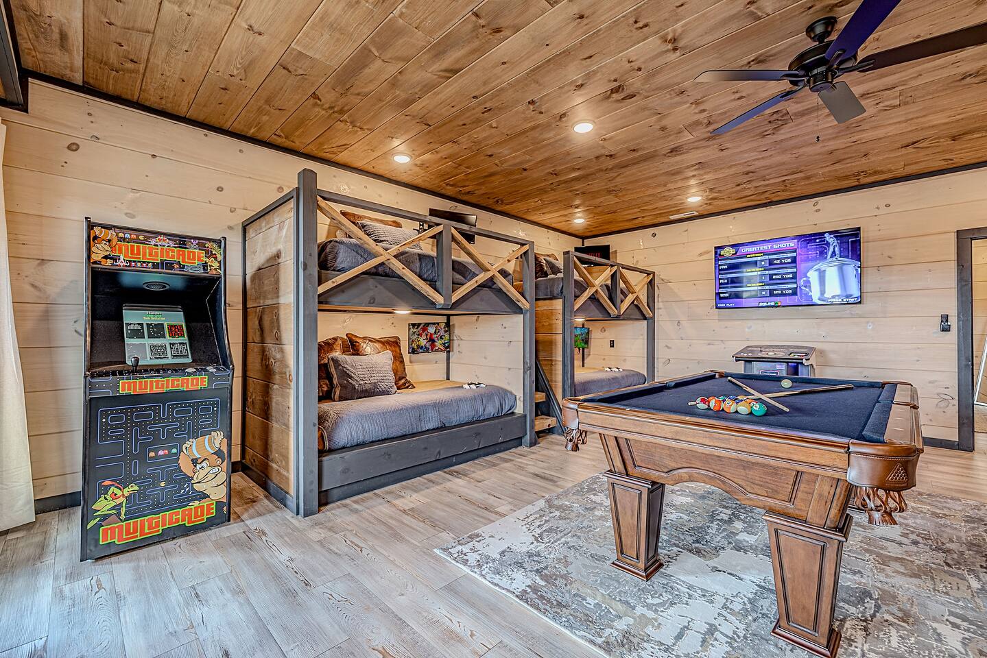 Cabin Details: Sleeps up to 21 guests Designed for Comfort & Privacy • 6 spacious bedrooms — 5 King bedrooms and 1 Queen • Plus Queen-over-king bunk in one of the king bedrooms • Third-floor living area with 2 oversized sets of built-in bunk beds (4 single beds total) • Private en-suite bathroom in every bedroom • Additional full bath with tub No waiting for showers. No one stuck with the “bad room.” Every guest gets their own comfortable retreat. Made for Gathering The large, fully stocked kitchen is perfect for feeding a crowd, featuring: • Expansive prep space • Two dining tables for large group meals • Open-concept layout ideal for entertaining From big holiday dinners to casual pancake breakfasts, there’s room for everyone. Entertainment on Every Level This cabin was built for fun: • Private Indoor Pool — swim year-round, rain or shine • Private Theater Room — movie nights just got better • Arcade games including Golden Tee plus game sticks on all four bunk bed tvs • Pool Table • Hot tub with mountain views • (2) Large sectional and firepit on one of three decks Whether it’s kids swimming for hours, teens battling it out in the arcade, or adults relaxing under the stars — everyone stays entertained. Waterpark Access Included Located inside the premier Smith Creek Resort community, guests enjoy access to the on-property waterpark — adding even more fun without ever leaving the neighborhood. It’s like having a mini resort vacation built into your stay. Three Levels of Mountain Views Step onto any of the three spacious decks to take in sweeping Smoky Mountain scenery. Morning coffee hits different when the mountains are glowing in front of you. Prime Location • Just 1 mile off the main Parkway in Pigeon Forge • 5 miles to Dollywood • 10 miles to Gatlinburg • 15 miles to Great Smoky Mountains National Park • Minutes from hiking, attractions, dining, activities (Zip lines), and shopping Close to everything — yet tucked away enough to feel peaceful and private. This is the kind of place where: • Kids never get bored • Parents actually relax • Grandparents feel comfortable • And everyone wants to rebook before checkout Accessories Included • EV Charger • Grill • Propane Firepit