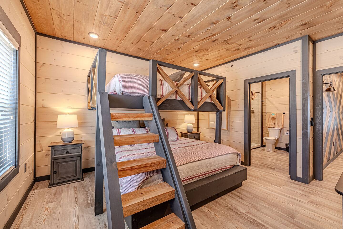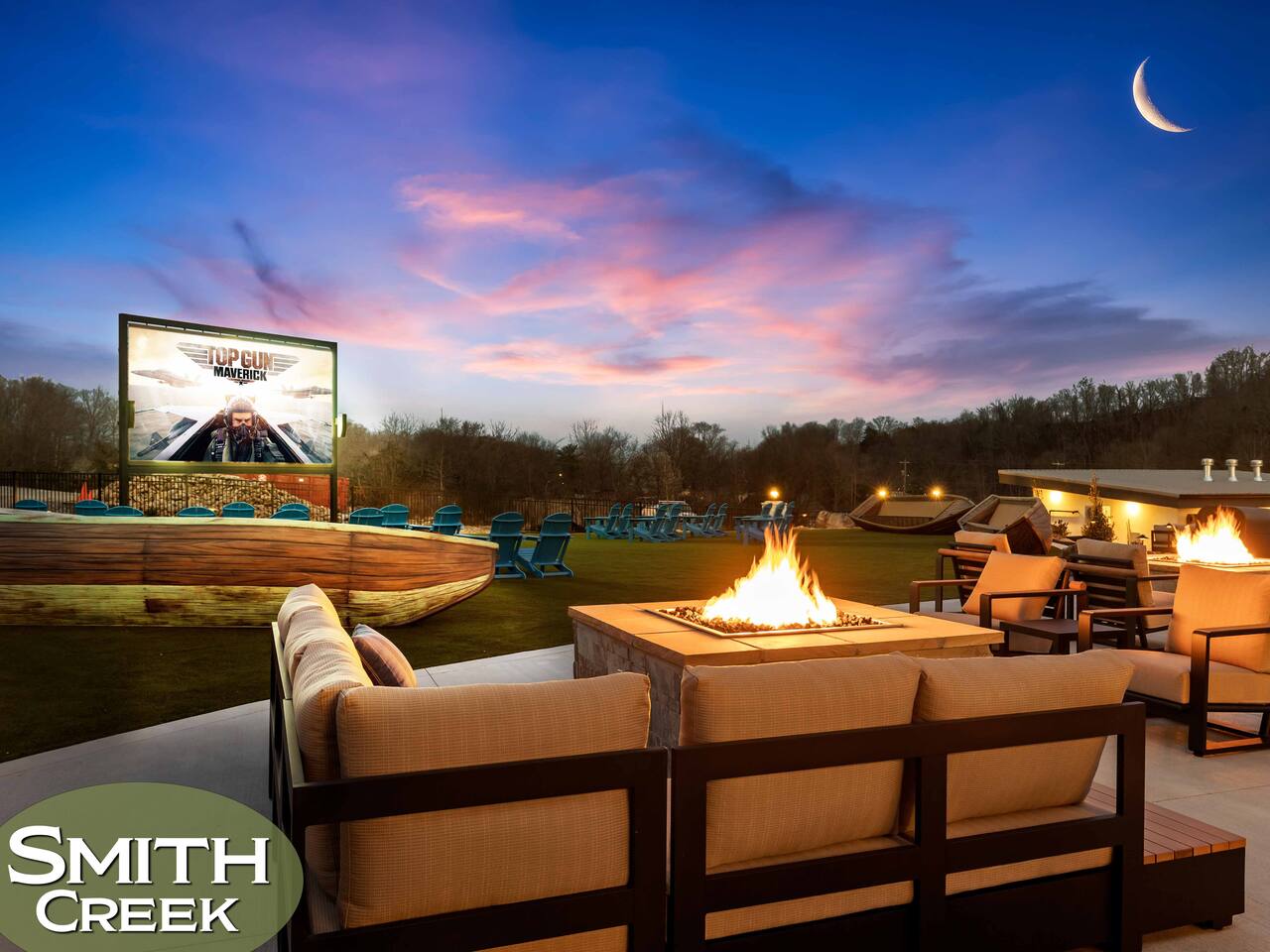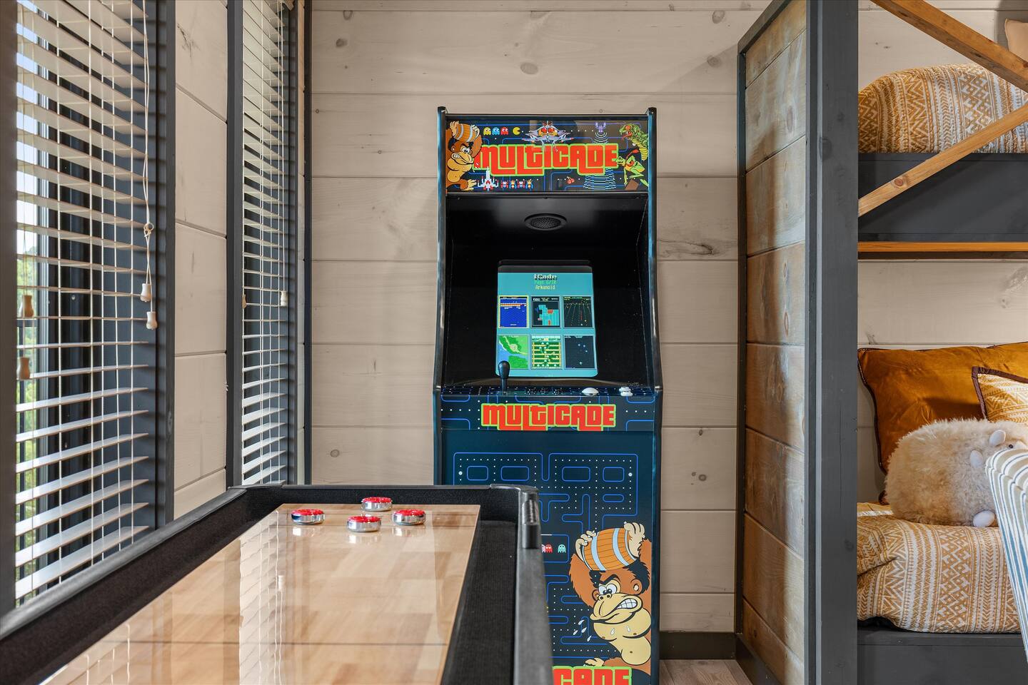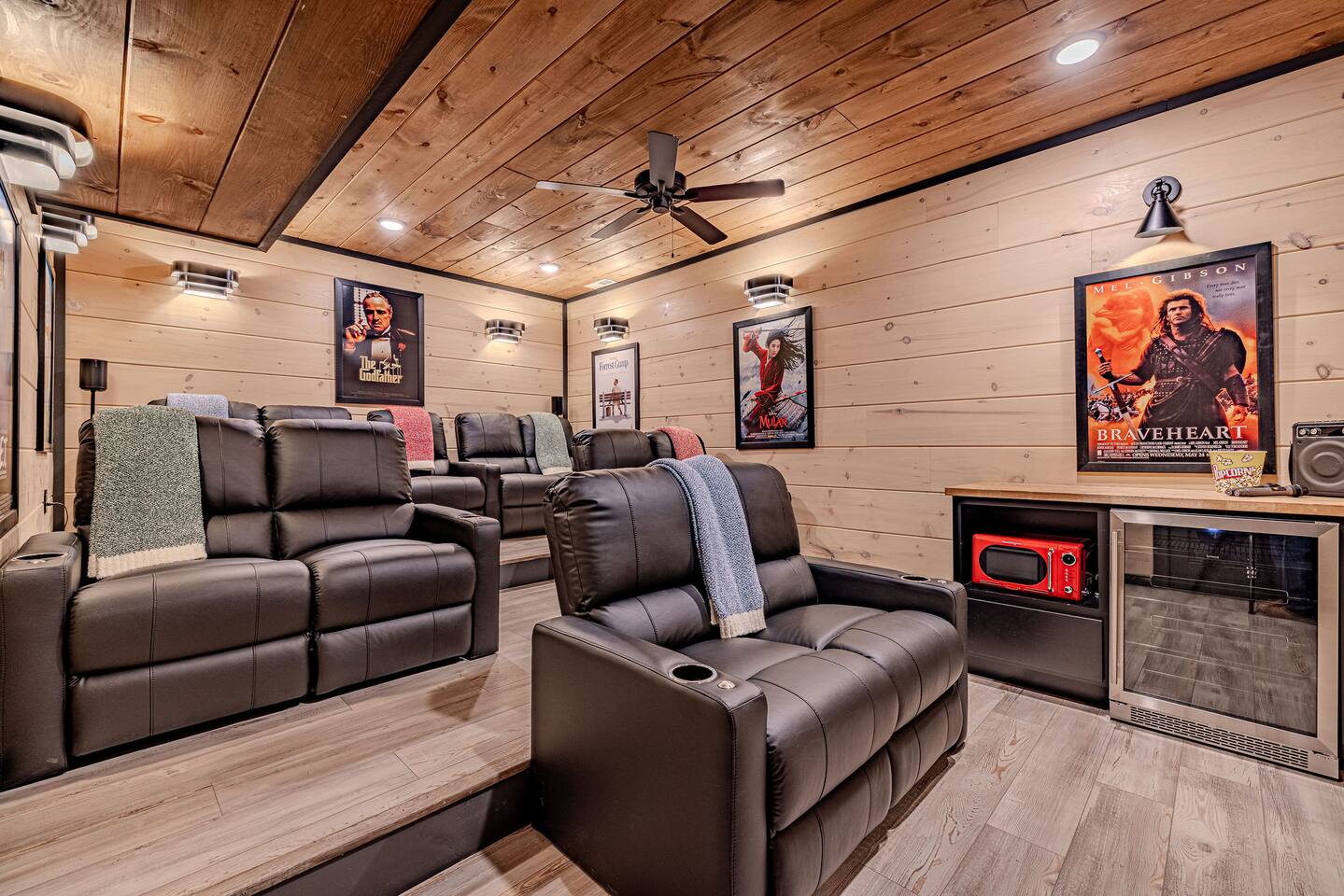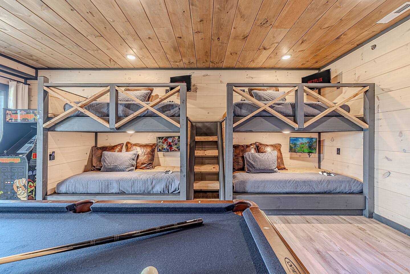 Cabin Details: Sleeps up to 21 guests Designed for Comfort & Privacy • 6 spacious bedrooms — 5 King bedrooms and 1 Queen • Plus Queen-over-king bunk in one of the king bedrooms • Third-floor living area with 2 oversized sets of built-in bunk beds (4 single beds total) • Private en-suite bathroom in every bedroom • Additional full bath with tub No waiting for showers. No one stuck with the “bad room.” Every guest gets their own comfortable retreat. Made for Gathering The large, fully stocked kitchen is perfect for feeding a crowd, featuring: • Expansive prep space • Two dining tables for large group meals • Open-concept layout ideal for entertaining From big holiday dinners to casual pancake breakfasts, there’s room for everyone. Entertainment on Every Level This cabin was built for fun: • Private Indoor Pool — swim year-round, rain or shine • Private Theater Room — movie nights just got better • Arcade games including Golden Tee plus game sticks on all four bunk bed tvs • Pool Table • Hot tub with mountain views • (2) Large sectional and firepit on one of three decks Whether it’s kids swimming for hours, teens battling it out in the arcade, or adults relaxing under the stars — everyone stays entertained. Waterpark Access Included Located inside the premier Smith Creek Resort community, guests enjoy access to the on-property waterpark — adding even more fun without ever leaving the neighborhood. It’s like having a mini resort vacation built into your stay. Three Levels of Mountain Views Step onto any of the three spacious decks to take in sweeping Smoky Mountain scenery. Morning coffee hits different when the mountains are glowing in front of you. Prime Location • Just 1 mile off the main Parkway in Pigeon Forge • 5 miles to Dollywood • 10 miles to Gatlinburg • 15 miles to Great Smoky Mountains National Park • Minutes from hiking, attractions, dining, activities (Zip lines), and shopping Close to everything — yet tucked away enough to feel peaceful and private. This is the kind of place where: • Kids never get bored • Parents actually relax • Grandparents feel comfortable • And everyone wants to rebook before checkout Accessories Included • EV Charger • Grill • Propane Firepit