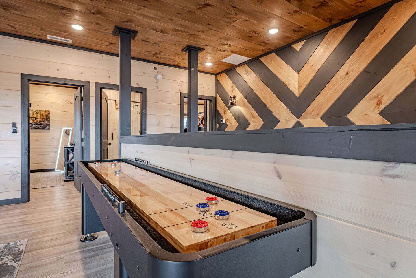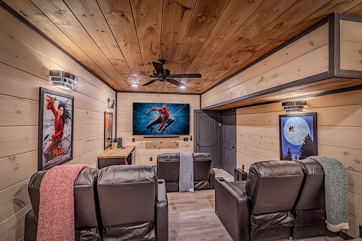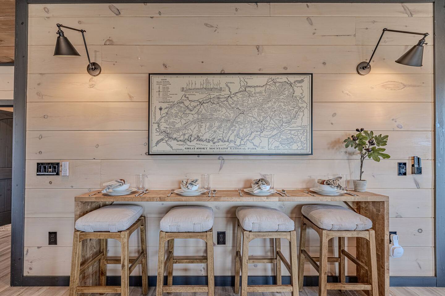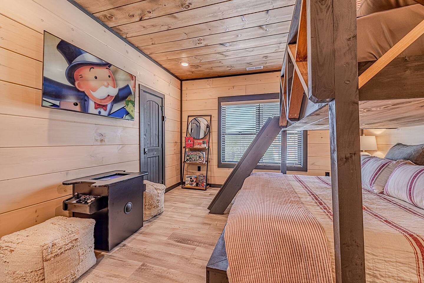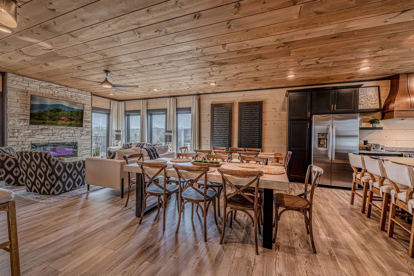 Cabin Details: Sleeps up to 21 guests Designed for Comfort & Privacy • 6 spacious bedrooms — 5 King bedrooms and 1 Queen • Plus Queen-over-king bunk in one of the king bedrooms • Third-floor living area with 2 oversized sets of built-in bunk beds (4 single beds total) • Private en-suite bathroom in every bedroom • Additional full bath with tub No waiting for showers. No one stuck with the “bad room.” Every guest gets their own comfortable retreat. Made for Gathering The large, fully stocked kitchen is perfect for feeding a crowd, featuring: • Expansive prep space • Two dining tables for large group meals • Open-concept layout ideal for entertaining From big holiday dinners to casual pancake breakfasts, there’s room for everyone. Entertainment on Every Level This cabin was built for fun: • Private Indoor Pool — swim year-round, rain or shine • Private Theater Room — movie nights just got better • Arcade games including Golden Tee plus game sticks on all four bunk bed tvs • Pool Table • Hot tub with mountain views • (2) Large sectional and firepit on one of three decks Whether it’s kids swimming for hours, teens battling it out in the arcade, or adults relaxing under the stars — everyone stays entertained. Waterpark Access Included Located inside the premier Smith Creek Resort community, guests enjoy access to the on-property waterpark — adding even more fun without ever leaving the neighborhood. It’s like having a mini resort vacation built into your stay. Three Levels of Mountain Views Step onto any of the three spacious decks to take in sweeping Smoky Mountain scenery. Morning coffee hits different when the mountains are glowing in front of you. Prime Location • Just 1 mile off the main Parkway in Pigeon Forge • 5 miles to Dollywood • 10 miles to Gatlinburg • 15 miles to Great Smoky Mountains National Park • Minutes from hiking, attractions, dining, activities (Zip lines), and shopping Close to everything — yet tucked away enough to feel peaceful and private. This is the kind of place where: • Kids never get bored • Parents actually relax • Grandparents feel comfortable • And everyone wants to rebook before checkout Accessories Included • EV Charger • Grill • Propane Firepit