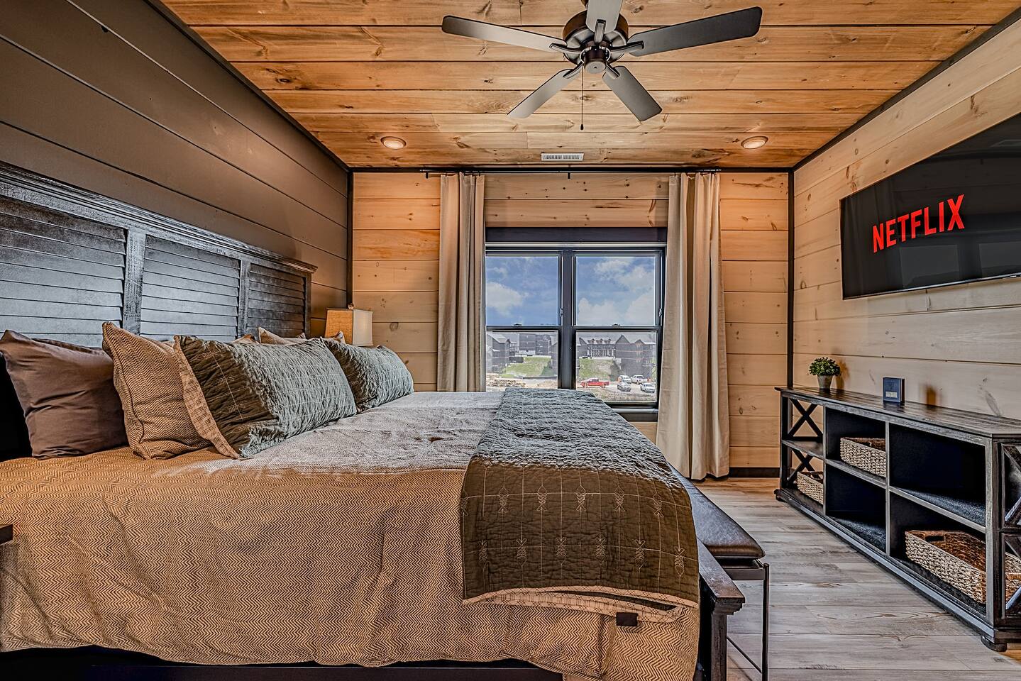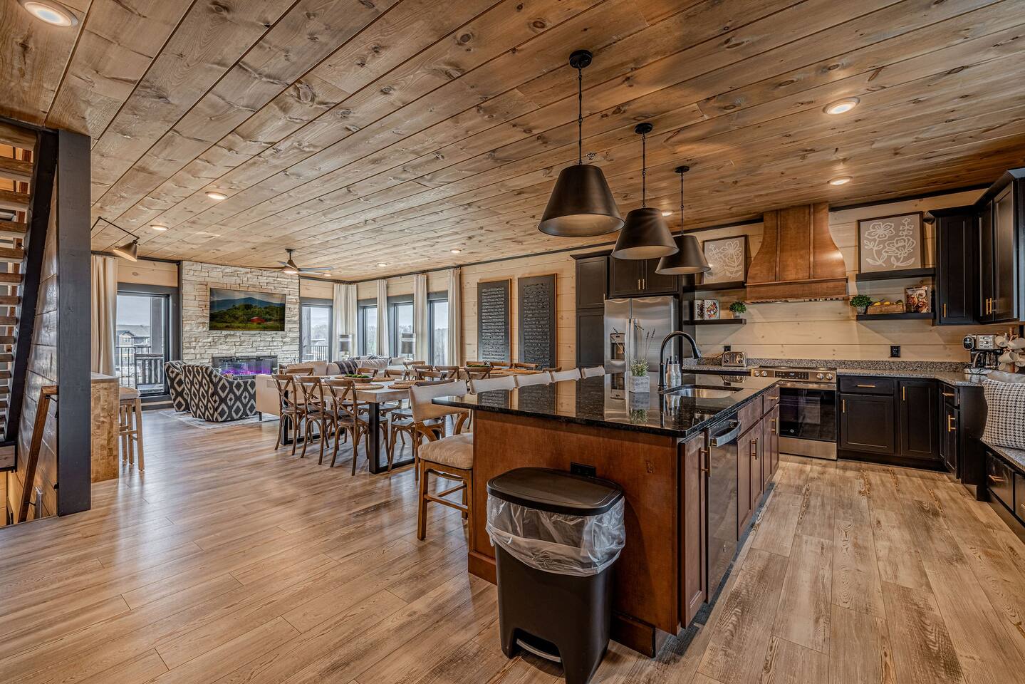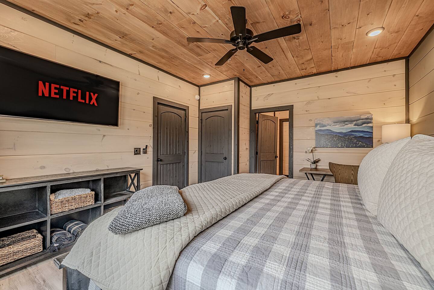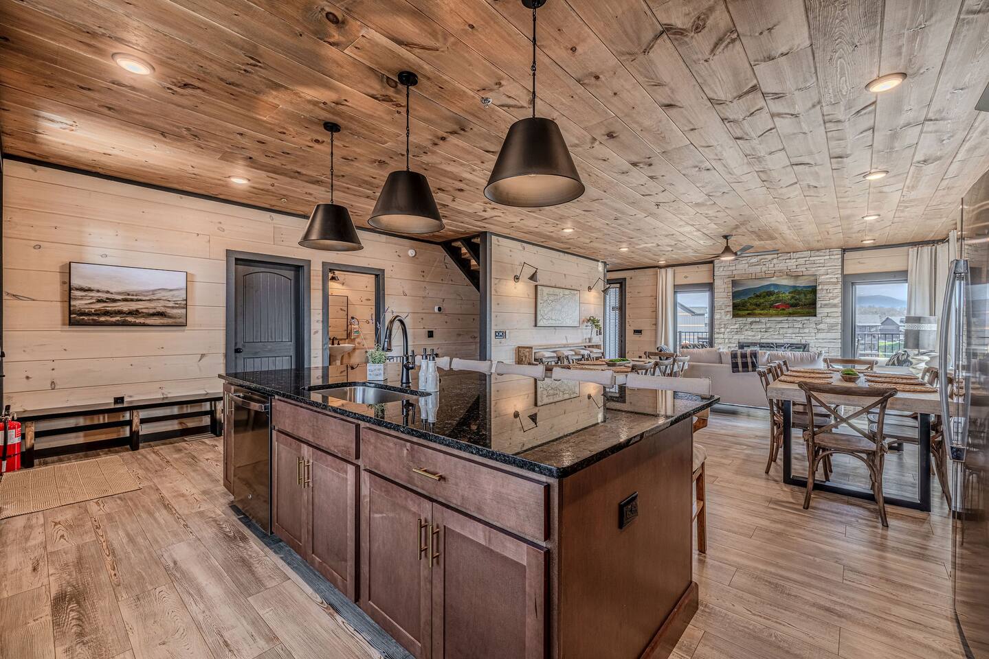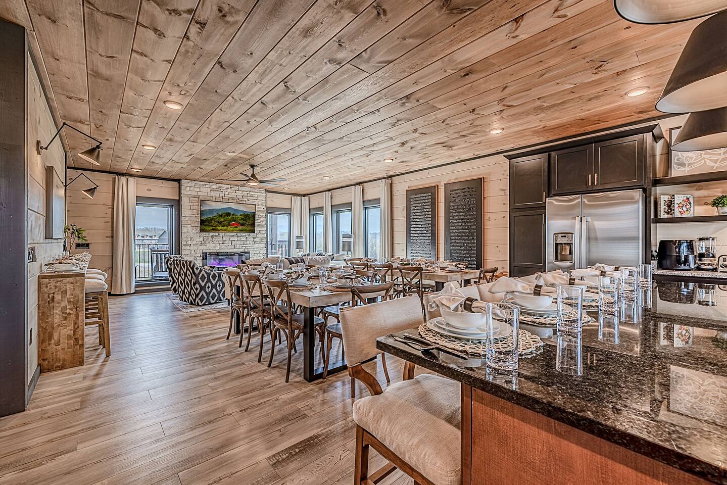 Cabin Details: Sleeps up to 21 guests Designed for Comfort & Privacy • 6 spacious bedrooms — 5 King bedrooms and 1 Queen • Plus Queen-over-king bunk in one of the king bedrooms • Third-floor living area with 2 oversized sets of built-in bunk beds (4 single beds total) • Private en-suite bathroom in every bedroom • Additional full bath with tub No waiting for showers. No one stuck with the “bad room.” Every guest gets their own comfortable retreat. Made for Gathering The large, fully stocked kitchen is perfect for feeding a crowd, featuring: • Expansive prep space • Two dining tables for large group meals • Open-concept layout ideal for entertaining From big holiday dinners to casual pancake breakfasts, there’s room for everyone. Entertainment on Every Level This cabin was built for fun: • Private Indoor Pool — swim year-round, rain or shine • Private Theater Room — movie nights just got better • Arcade games including Golden Tee plus game sticks on all four bunk bed tvs • Pool Table • Hot tub with mountain views • (2) Large sectional and firepit on one of three decks Whether it’s kids swimming for hours, teens battling it out in the arcade, or adults relaxing under the stars — everyone stays entertained. Waterpark Access Included Located inside the premier Smith Creek Resort community, guests enjoy access to the on-property waterpark — adding even more fun without ever leaving the neighborhood. It’s like having a mini resort vacation built into your stay. Three Levels of Mountain Views Step onto any of the three spacious decks to take in sweeping Smoky Mountain scenery. Morning coffee hits different when the mountains are glowing in front of you. Prime Location • Just 1 mile off the main Parkway in Pigeon Forge • 5 miles to Dollywood • 10 miles to Gatlinburg • 15 miles to Great Smoky Mountains National Park • Minutes from hiking, attractions, dining, activities (Zip lines), and shopping Close to everything — yet tucked away enough to feel peaceful and private. This is the kind of place where: • Kids never get bored • Parents actually relax • Grandparents feel comfortable • And everyone wants to rebook before checkout Accessories Included • EV Charger • Grill • Propane Firepit