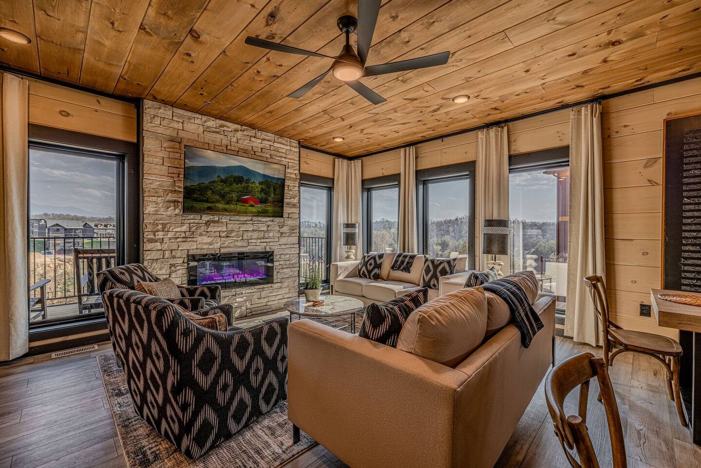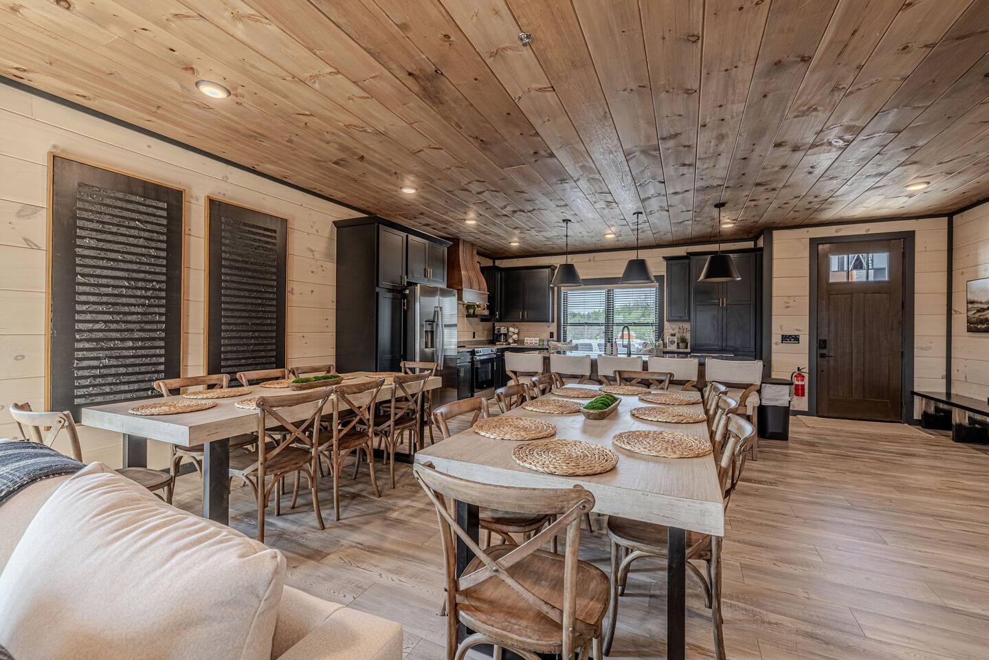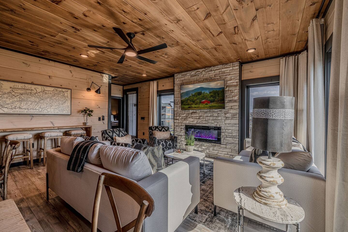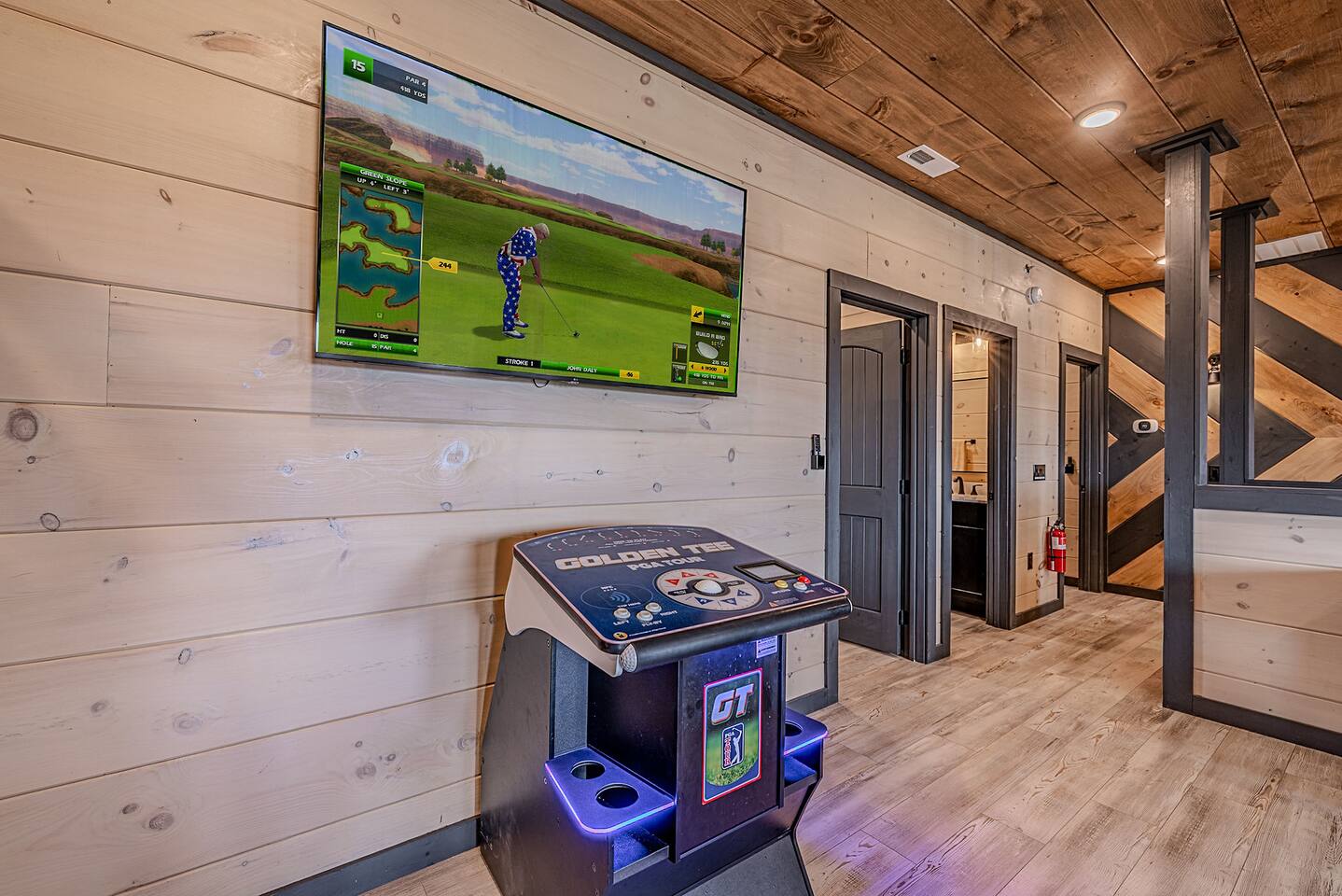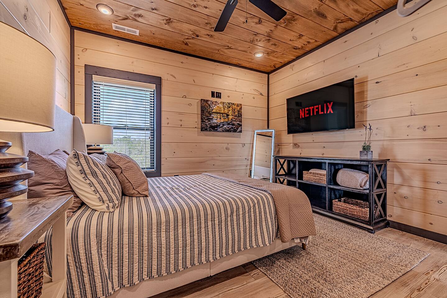 Cabin Details: Sleeps up to 21 guests Designed for Comfort & Privacy • 6 spacious bedrooms — 5 King bedrooms and 1 Queen • Plus Queen-over-king bunk in one of the king bedrooms • Third-floor living area with 2 oversized sets of built-in bunk beds (4 single beds total) • Private en-suite bathroom in every bedroom • Additional full bath with tub No waiting for showers. No one stuck with the “bad room.” Every guest gets their own comfortable retreat. Made for Gathering The large, fully stocked kitchen is perfect for feeding a crowd, featuring: • Expansive prep space • Two dining tables for large group meals • Open-concept layout ideal for entertaining From big holiday dinners to casual pancake breakfasts, there’s room for everyone. Entertainment on Every Level This cabin was built for fun: • Private Indoor Pool — swim year-round, rain or shine • Private Theater Room — movie nights just got better • Arcade games including Golden Tee plus game sticks on all four bunk bed tvs • Pool Table • Hot tub with mountain views • (2) Large sectional and firepit on one of three decks Whether it’s kids swimming for hours, teens battling it out in the arcade, or adults relaxing under the stars — everyone stays entertained. Waterpark Access Included Located inside the premier Smith Creek Resort community, guests enjoy access to the on-property waterpark — adding even more fun without ever leaving the neighborhood. It’s like having a mini resort vacation built into your stay. Three Levels of Mountain Views Step onto any of the three spacious decks to take in sweeping Smoky Mountain scenery. Morning coffee hits different when the mountains are glowing in front of you. Prime Location • Just 1 mile off the main Parkway in Pigeon Forge • 5 miles to Dollywood • 10 miles to Gatlinburg • 15 miles to Great Smoky Mountains National Park • Minutes from hiking, attractions, dining, activities (Zip lines), and shopping Close to everything — yet tucked away enough to feel peaceful and private. This is the kind of place where: • Kids never get bored • Parents actually relax • Grandparents feel comfortable • And everyone wants to rebook before checkout Accessories Included • EV Charger • Grill • Propane Firepit