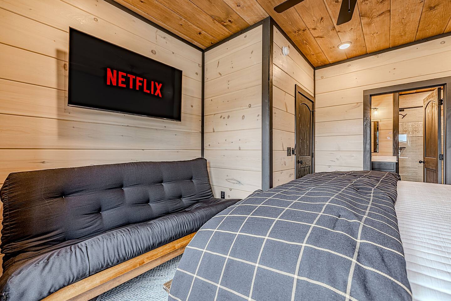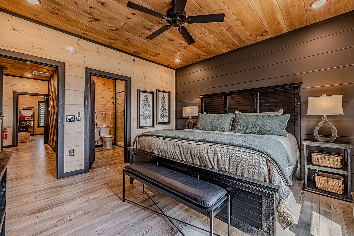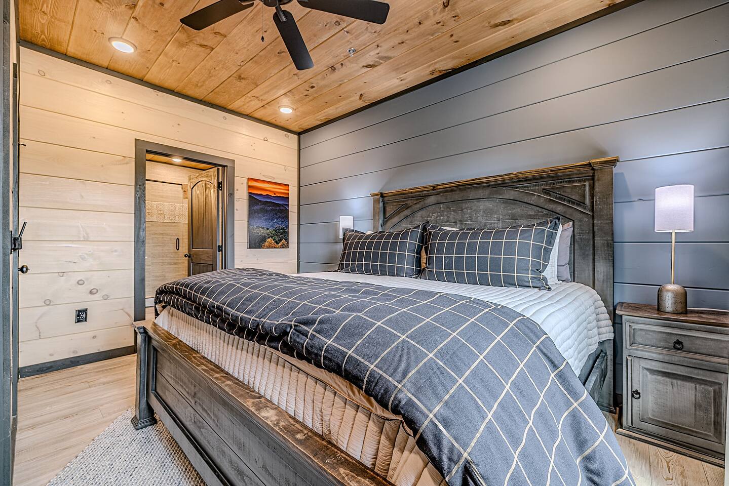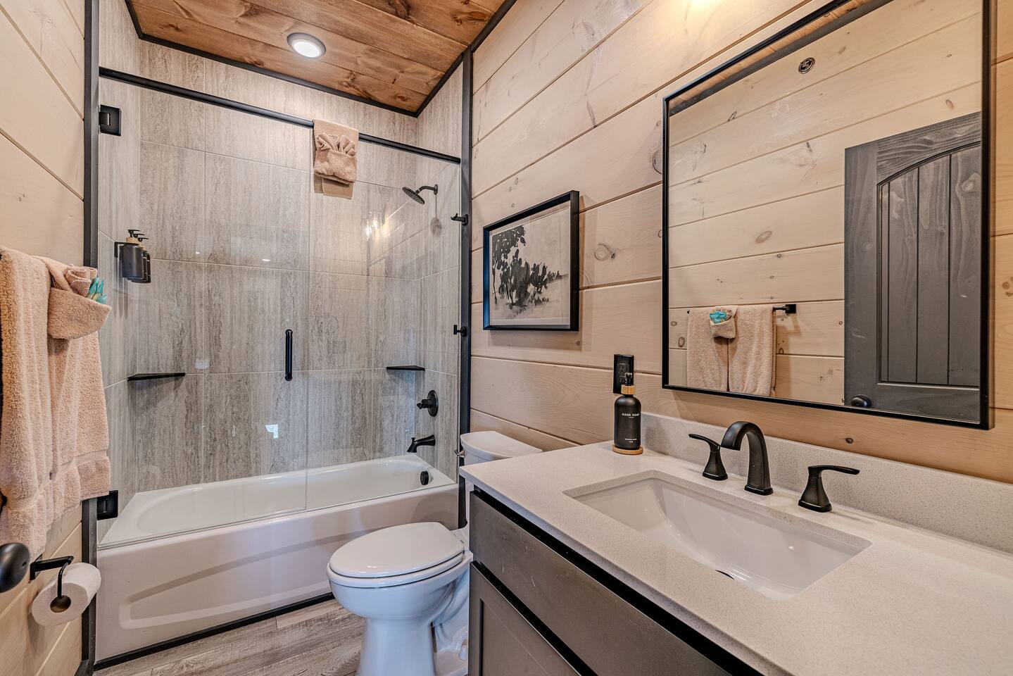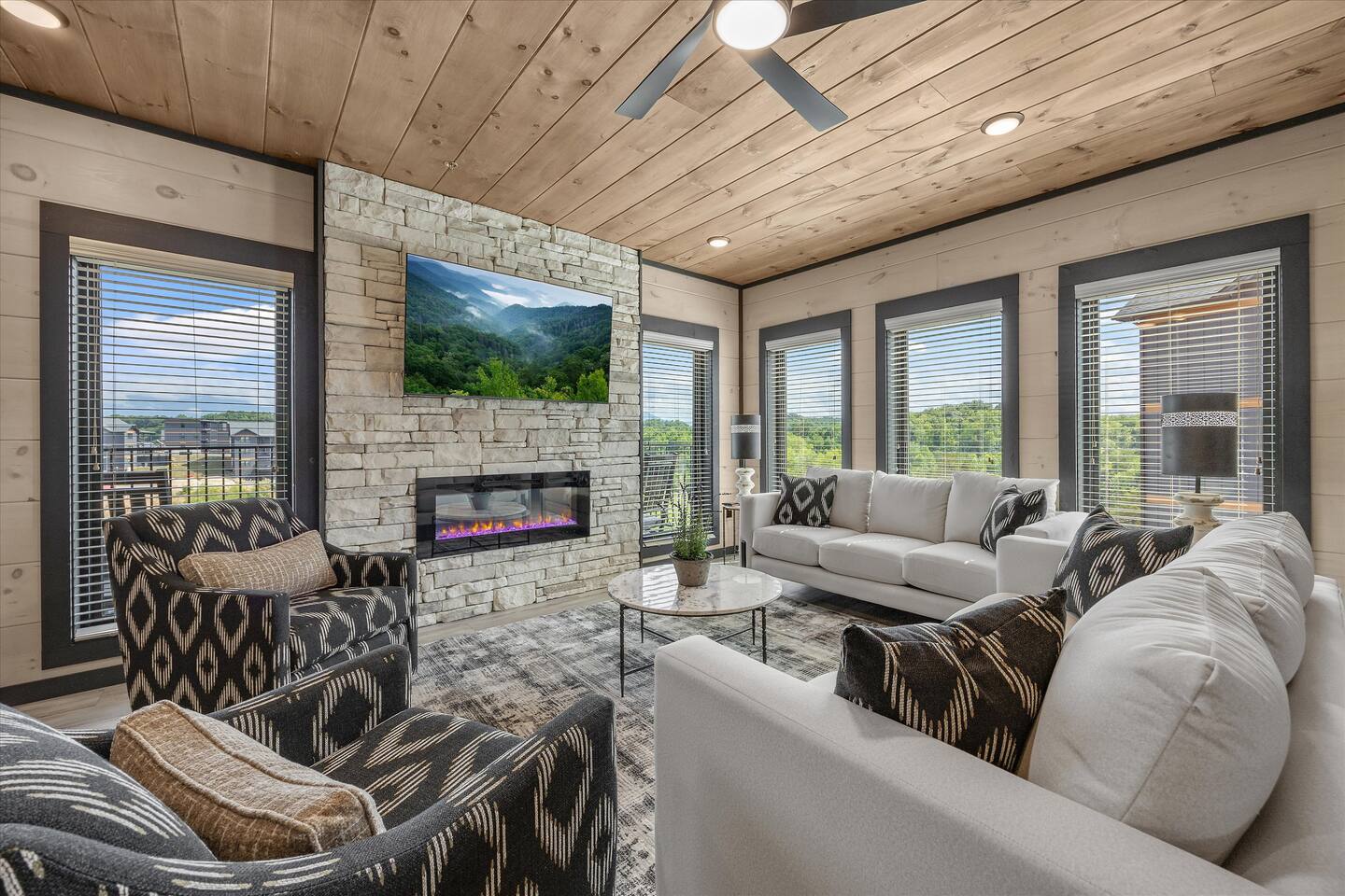 Cabin Details: Sleeps up to 21 guests Designed for Comfort & Privacy • 6 spacious bedrooms — 5 King bedrooms and 1 Queen • Plus Queen-over-king bunk in one of the king bedrooms • Third-floor living area with 2 oversized sets of built-in bunk beds (4 single beds total) • Private en-suite bathroom in every bedroom • Additional full bath with tub No waiting for showers. No one stuck with the “bad room.” Every guest gets their own comfortable retreat. Made for Gathering The large, fully stocked kitchen is perfect for feeding a crowd, featuring: • Expansive prep space • Two dining tables for large group meals • Open-concept layout ideal for entertaining From big holiday dinners to casual pancake breakfasts, there’s room for everyone. Entertainment on Every Level This cabin was built for fun: • Private Indoor Pool — swim year-round, rain or shine • Private Theater Room — movie nights just got better • Arcade games including Golden Tee plus game sticks on all four bunk bed tvs • Pool Table • Hot tub with mountain views • (2) Large sectional and firepit on one of three decks Whether it’s kids swimming for hours, teens battling it out in the arcade, or adults relaxing under the stars — everyone stays entertained. Waterpark Access Included Located inside the premier Smith Creek Resort community, guests enjoy access to the on-property waterpark — adding even more fun without ever leaving the neighborhood. It’s like having a mini resort vacation built into your stay. Three Levels of Mountain Views Step onto any of the three spacious decks to take in sweeping Smoky Mountain scenery. Morning coffee hits different when the mountains are glowing in front of you. Prime Location • Just 1 mile off the main Parkway in Pigeon Forge • 5 miles to Dollywood • 10 miles to Gatlinburg • 15 miles to Great Smoky Mountains National Park • Minutes from hiking, attractions, dining, activities (Zip lines), and shopping Close to everything — yet tucked away enough to feel peaceful and private. This is the kind of place where: • Kids never get bored • Parents actually relax • Grandparents feel comfortable • And everyone wants to rebook before checkout Accessories Included • EV Charger • Grill • Propane Firepit